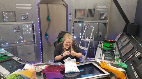 With Caitlin back on her feet, we took the elements of the set to a large room I'd hired within a local business centre in my home town of Nuneaton. The set was later re-vamped during the filming to become three different ship interiors - and it worked a treat!